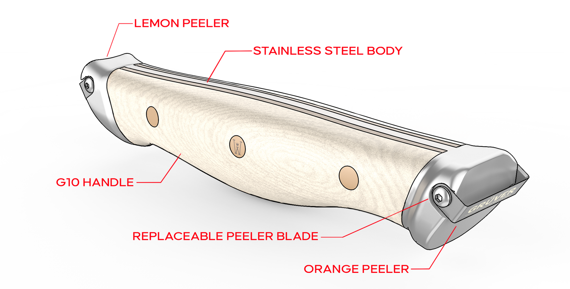 Traditional Y-peelers are hazardous, wasteful, and leave jagged edges that require extra trimming with a knife. Grüver eliminates all that. Its dual patented groove blades — 19mm for lemon, 26mm for orange — cut perfect, straight-sided citrus ribbons in a single pass.